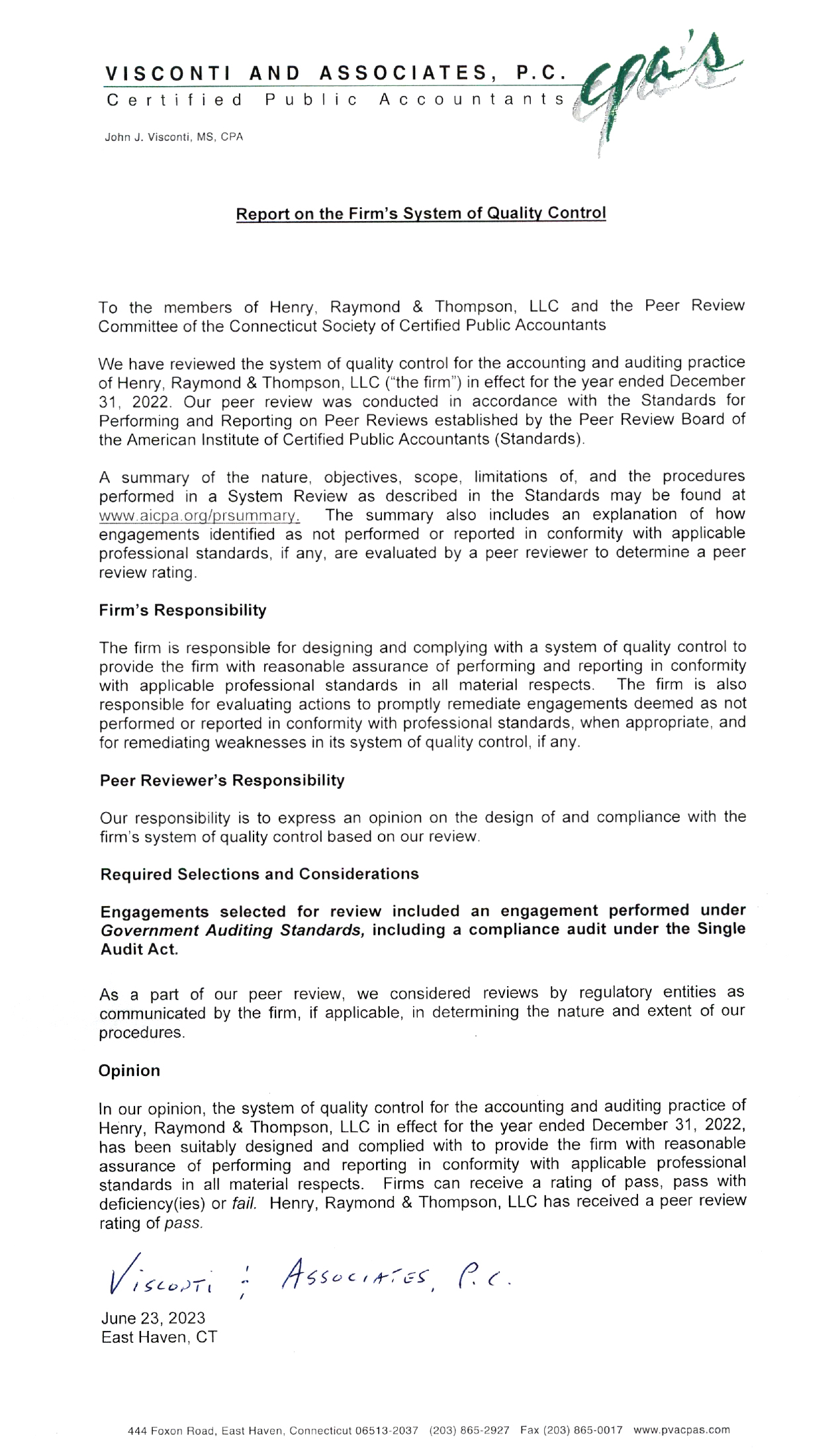 System Review Report Henry, Raymond & Thompson, LLC and the